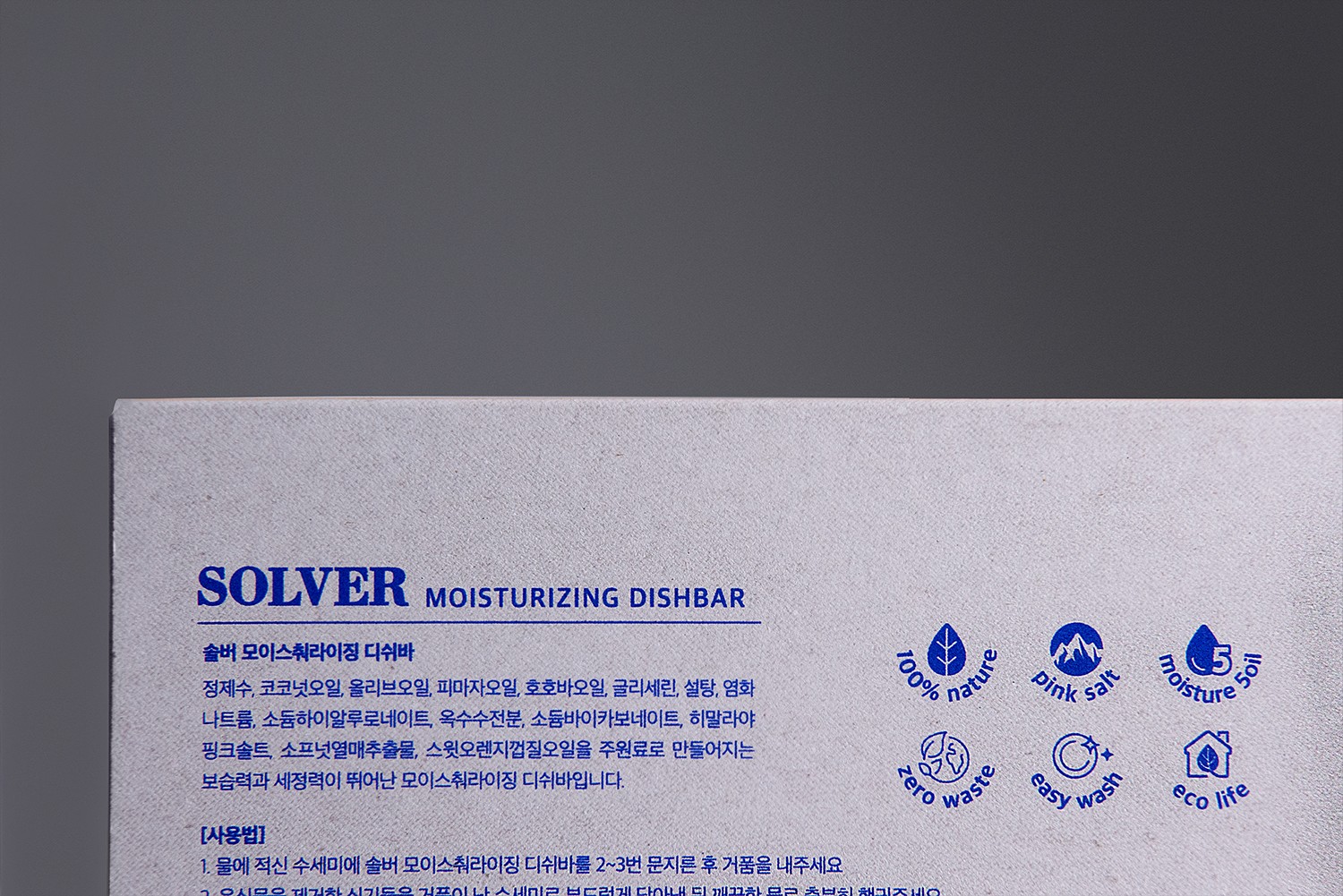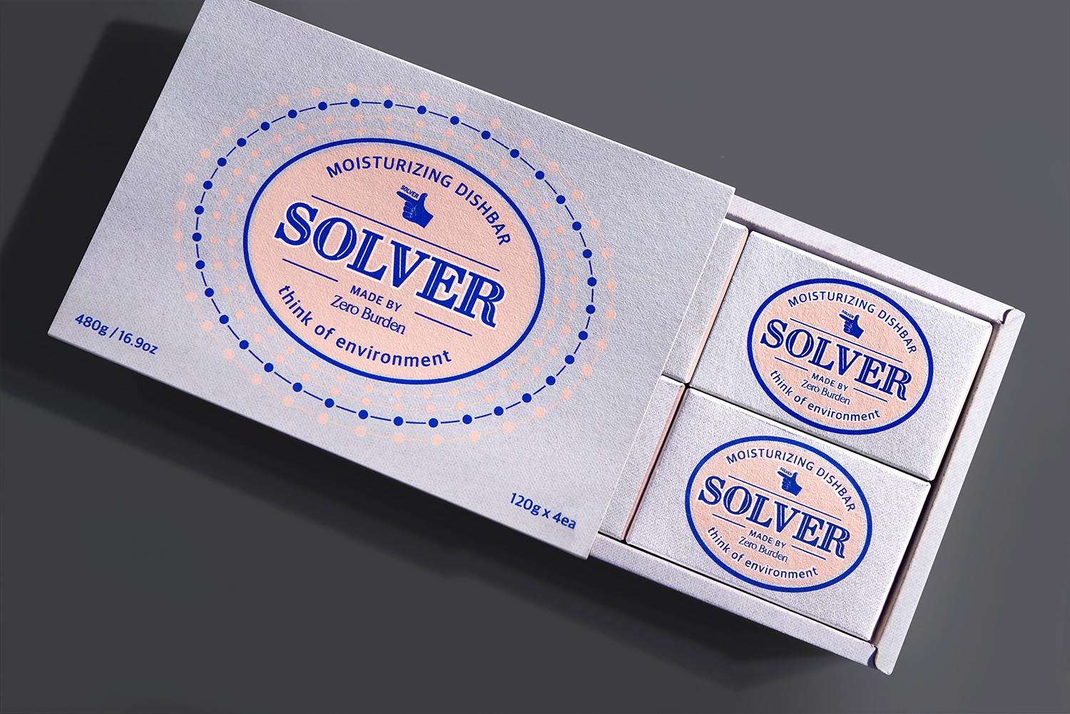Zero Burden은 자연 유래 성분으로 라이프 케어 제품을 만드는 브랜드입니다. ‘해결사’라는 이름의 Solver 모이스춰라이징 디쉬바는 단순한 주방 세제가 아니라, 환경과 일상의 균형을 제안하는 오브제로 기획되었습니다. 이번 프로젝트는 하이디자인(HiDesign)이 그래픽과 콘셉트를 설계하고, 박스마스터(Boxmaster)가 그 디자인을 실제 구조와 질감으로 구현한 협업입니다.