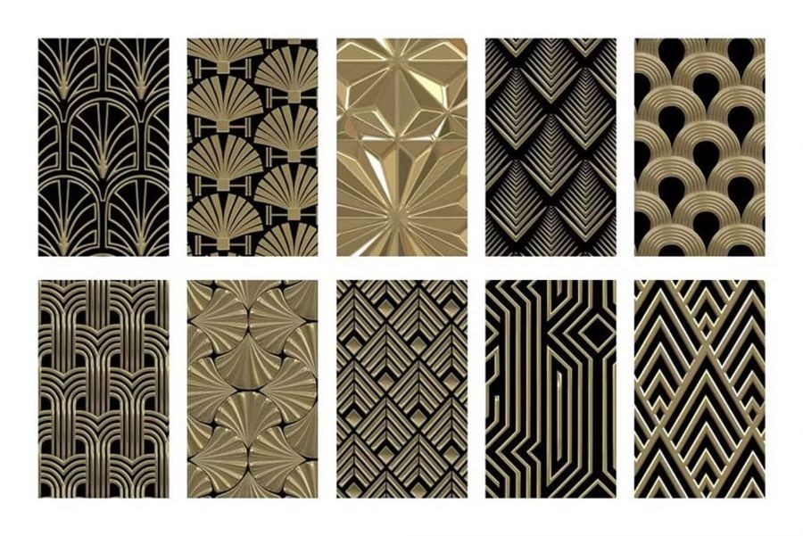 - 아르데코 패턴은 금색과 은색의 금속성 액센트로 빛나지 만, 에메랄드, 사파이어와 같은 보석 톤도 고급스러운 느낌을 주기 위해 사용됩니다.